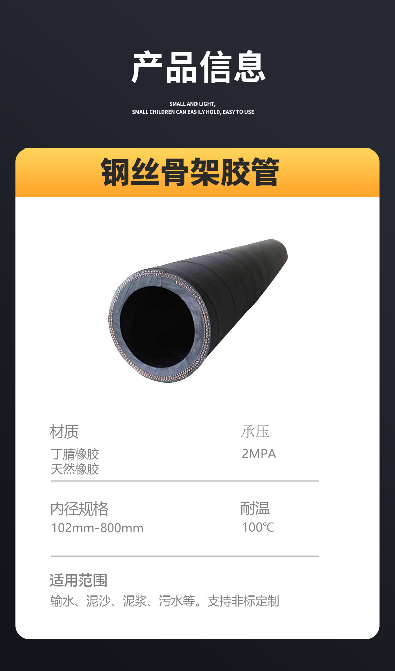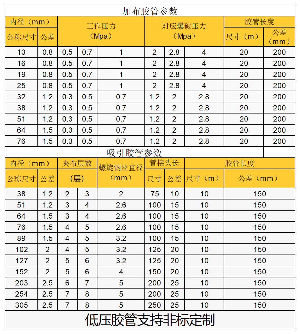 夾布增強層、簾子線增強層、鋼絲骨架增(zēng)強、鋼絲編織/纏繞增強、最大承壓可達(dá)100MPA
