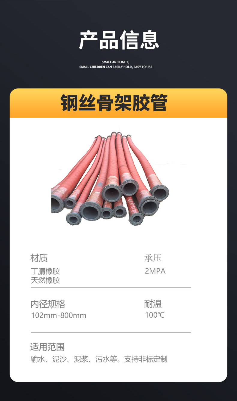 夾布增(zēng)強層、簾子線增強層(céng)、鋼絲骨架增強、鋼絲編織/纏繞增強、最大承壓(yā)可達100MPA