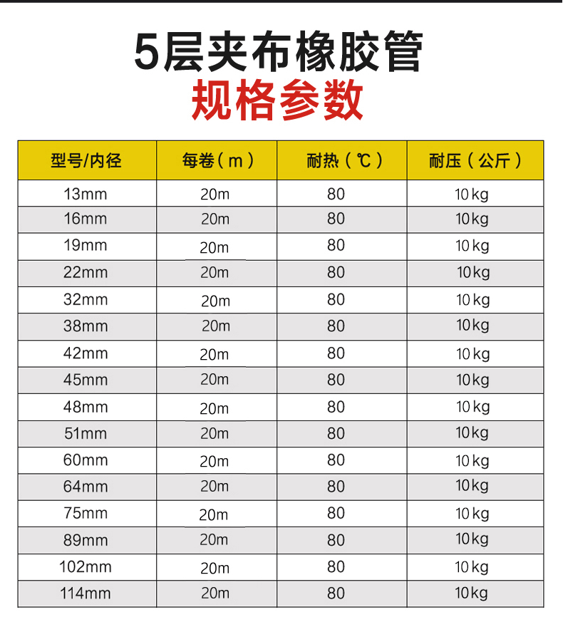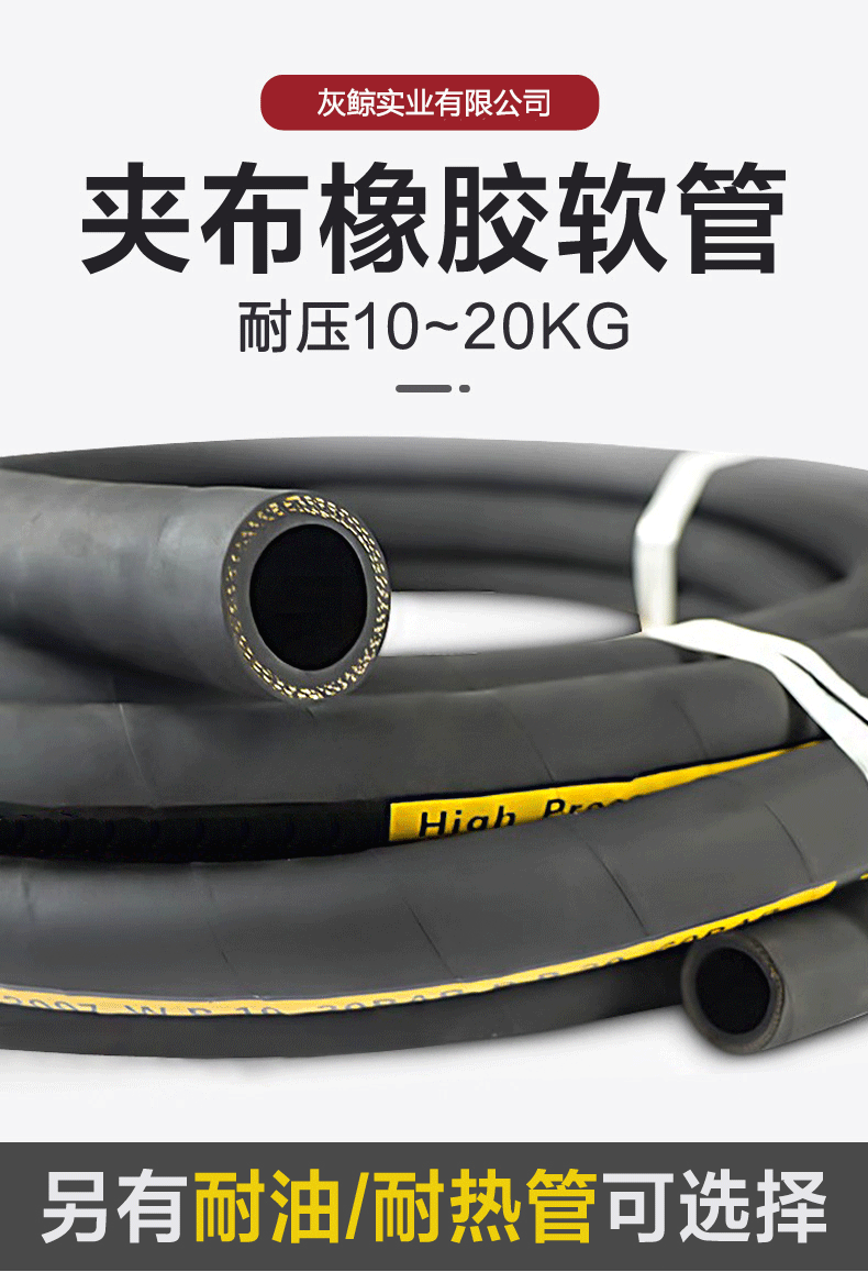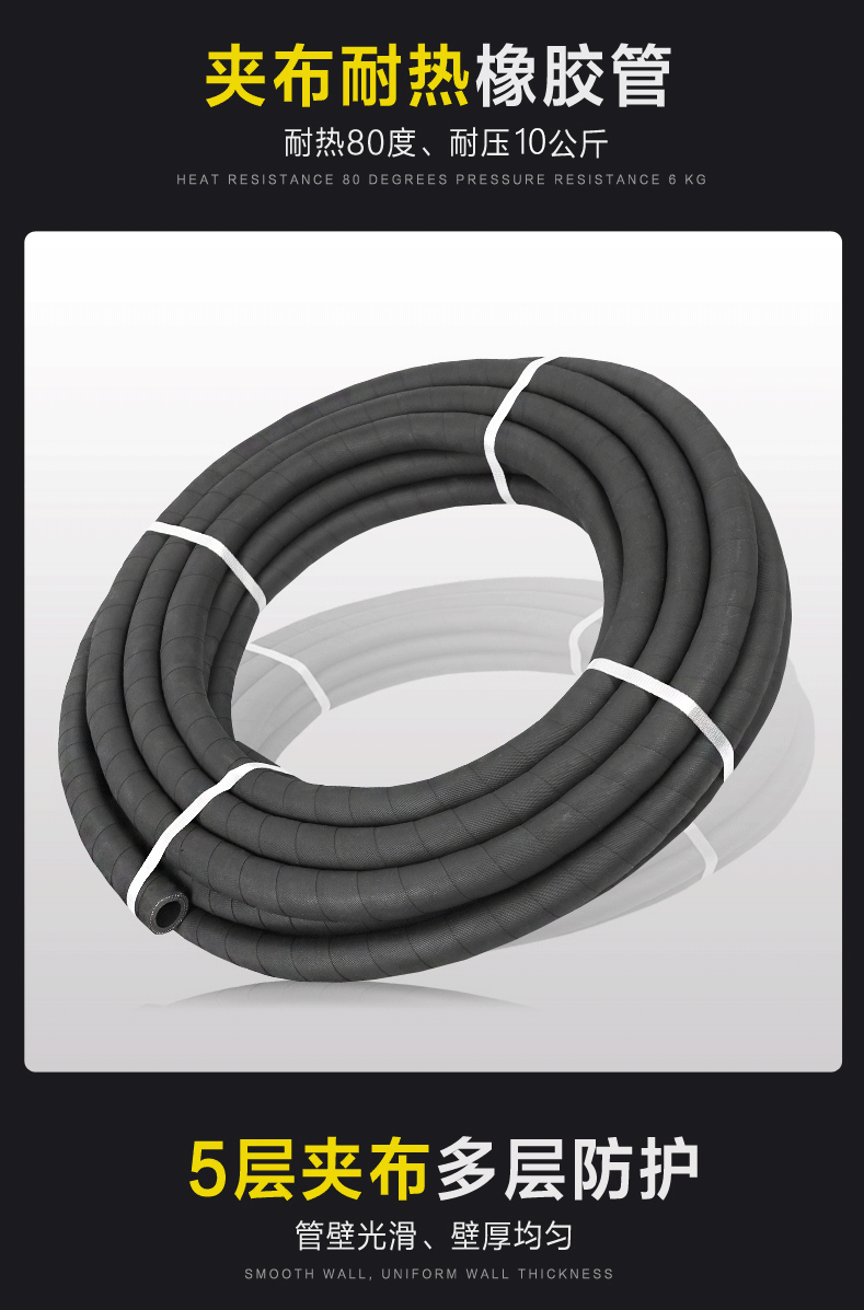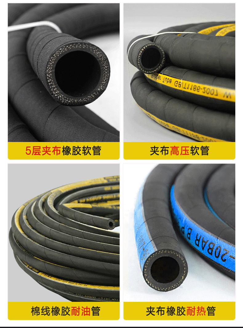 夾布增強(qiáng)層、簾子線(xiàn)增強層、鋼絲骨架增強、鋼絲編(biān)織/纏繞增(zēng)強(qiáng)、最大承壓可達100MPA