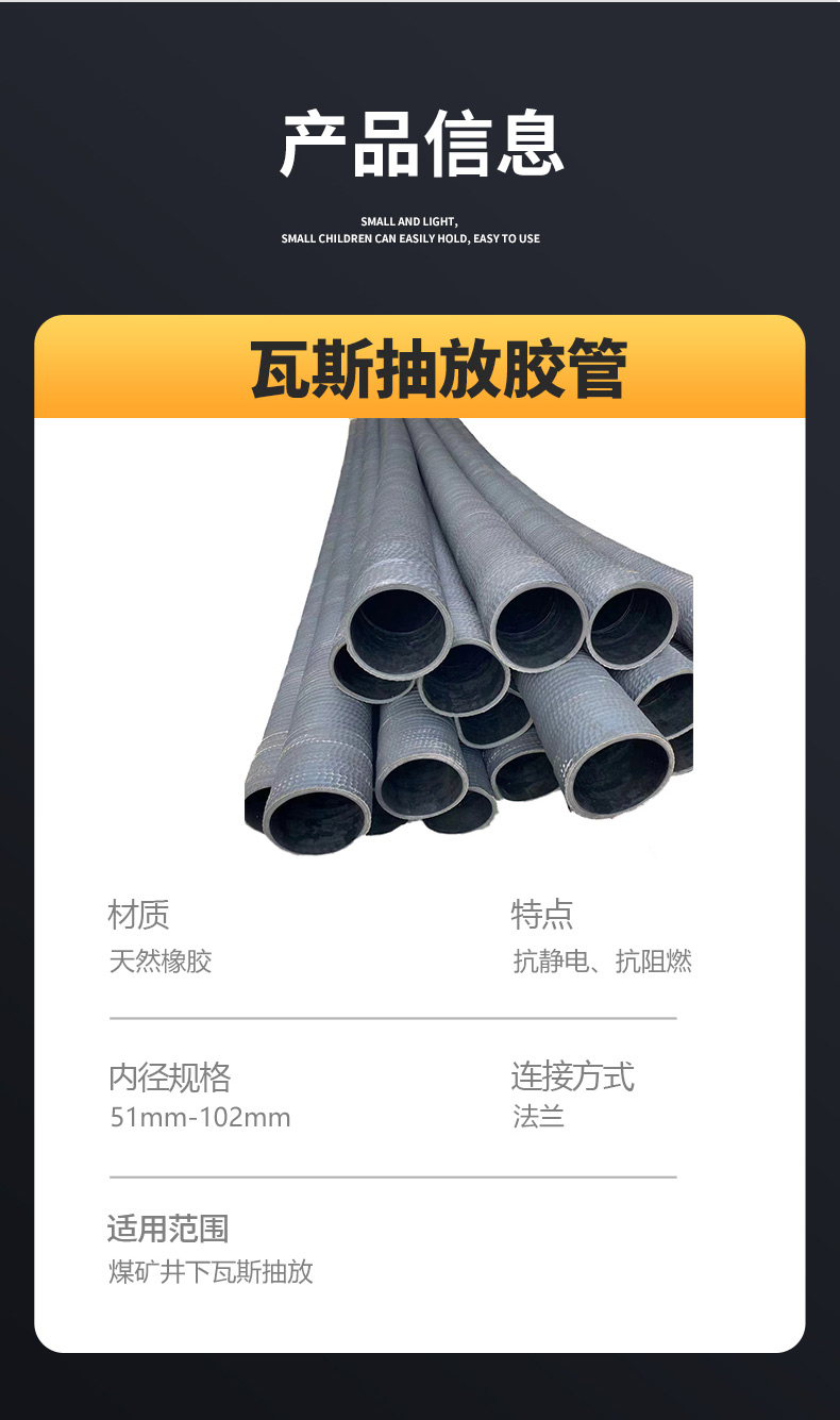 瓦斯抽放膠(jiāo)管主要用於煤礦井下瓦斯負壓抽(chōu)放管路及裝(zhuāng)置間的柔(róu)性(xìng)鏈接 產(chǎn)品特點:阻燃、抗靜電、強度大耐衝擊、耐腐蝕性強。 重量輕、壽命長、施工方便