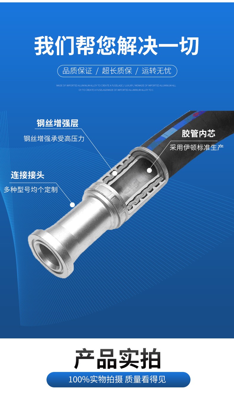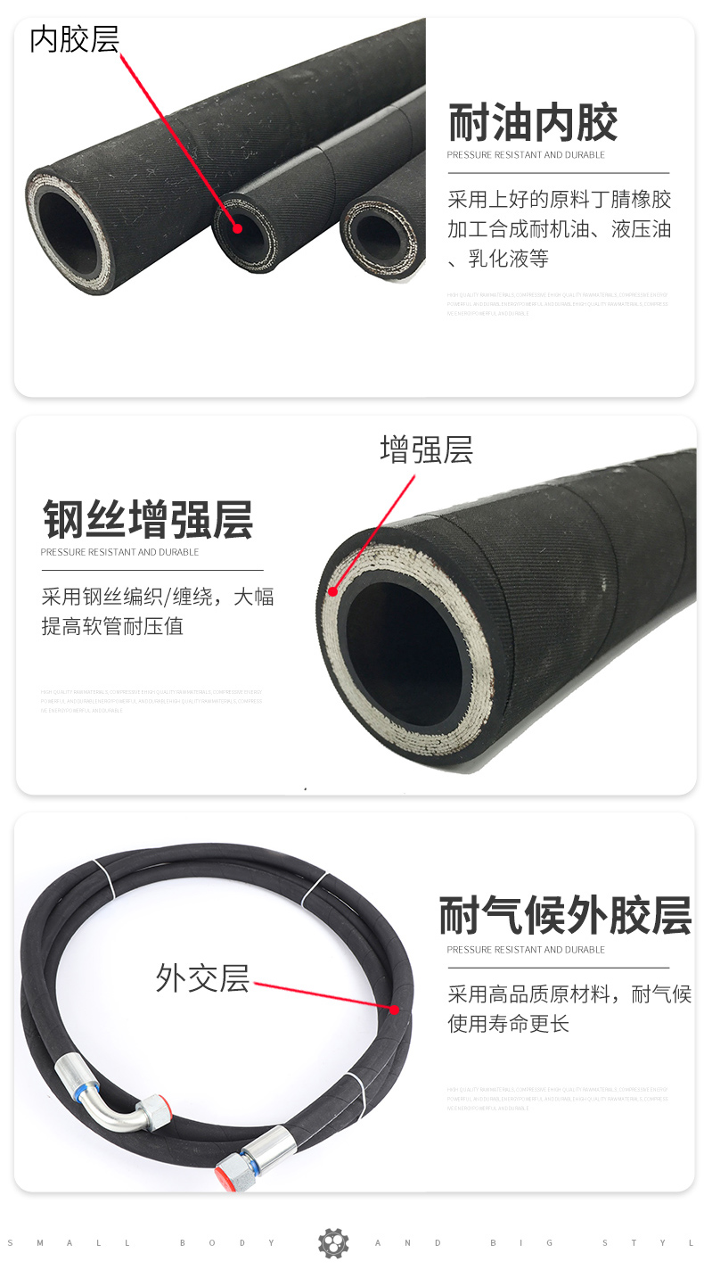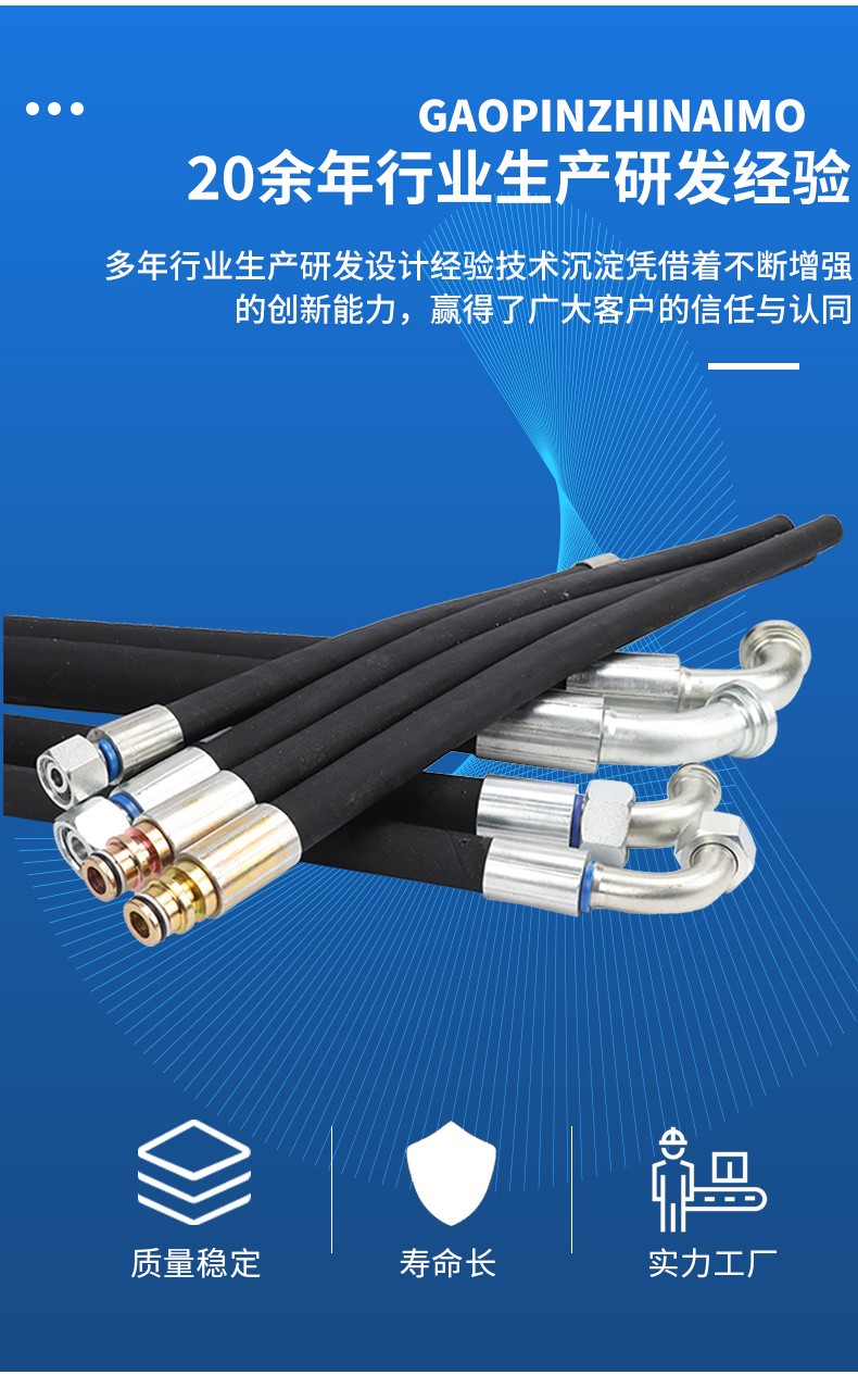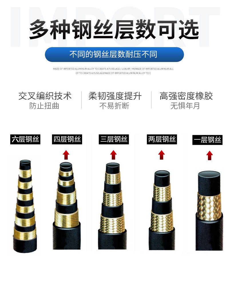 夾布增強層、簾子(zǐ)線增強層、鋼絲骨架增強、鋼絲編織/纏繞增強、最大承壓可達100MPA